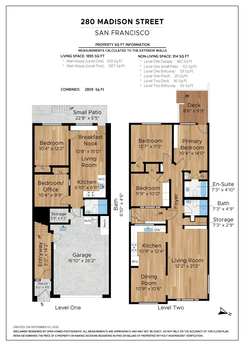 Floor plan of a two-level house located at 280 Madison Street, San Francisco. The first level includes a garage, storage, a mechanical room, a bedroom or office, a bathroom, and a small patio. The second level features a living room, dining room, two bedrooms, a primary bedroom with an en-suite bathroom, a second bathroom, additional storage, a kitchen, and a deck.